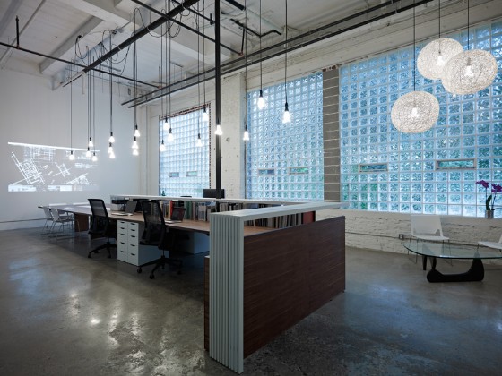 The layout was conceived as an area that offers both functionality and flexibility while supporting the many ways users can operate within it. A custom walnut desk serves as the spine for the firm, slicing through the centre of the room serving as a work station, layout areas and meeting table. The existing warehouse offered a unique aesthetic that defines the studio. Large glass block openings on the east wall filter natural light throughout the morning. Countering this is an art installation completed by the design team. 44,000 golf tees line the surface which depicts an aerial graphic of the local neighborhood. The intention was to create a single element that could offer the opportunities for the users to work in close proximity with one another in multiple configurations. |